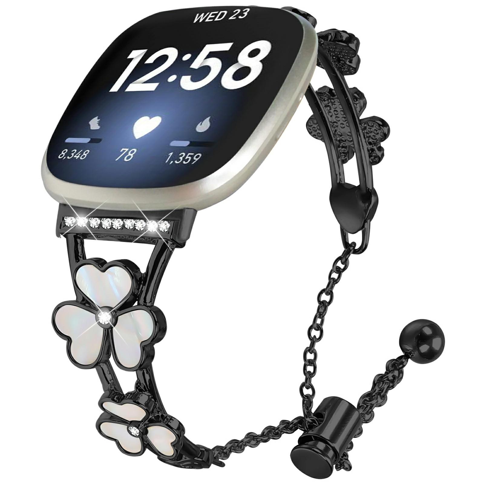 For Fitbit Versa 3/Sense Watchband Heart Clover Decor Zinc Alloy Metal Strap Black