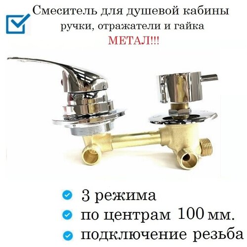 Смеситель для душевой кабины на 3 режима, межосевое расстояние 100 мм. подключение под хомут, прижимная гайка на резьбе, ручки и отражатель метал.