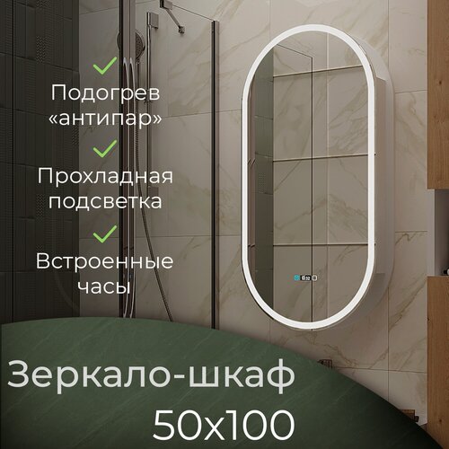 Настенный зеркало шкаф Savage white 50х100 (черный,часы, подогрев, с LED подсветкой, регулировка яркости, с полкой, для ванной)