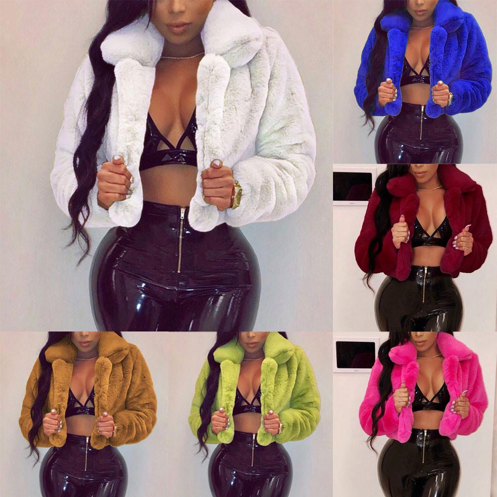 Мода Женщины Пальто Пушистое флисовое отложенный воротник Искусственный мех Топ Короткое свободное пальто
