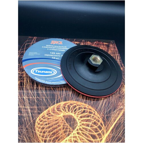 Опорная тарелка 125мм+9 наждачных кругов Р40 Р60 Р80 по 3 шт., Насадка шлифовальная 125мм, шлифовальный круг на липучке TSUNAMI