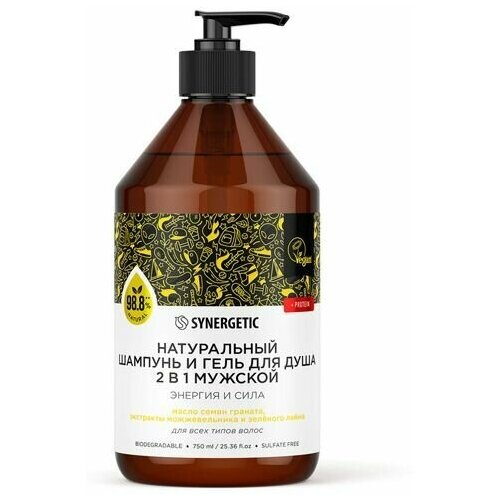 SYNERGETIC Шампунь и гель для душа бессульфатный "Энергия и сила" 2 в 1, мужской, 750 мл