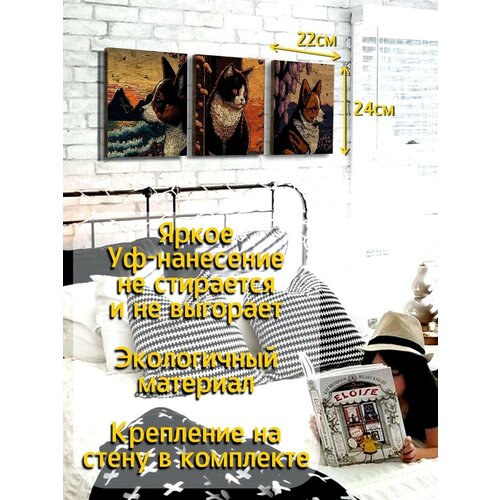 Модульная картина на дереве, размер 66x24, модель животные дикая кошка - 5017