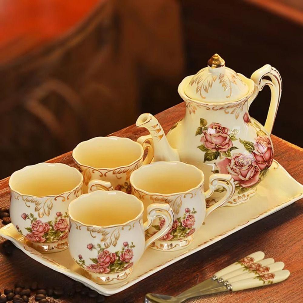 Ceramic Coffee Cup Set European Style Afternoon Tea Cup European Porcelain Tea Set Drinkware Rose 6+1
