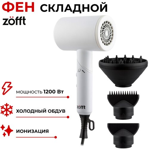 Фен для волос профессиональный Zofft с ионизацией, складной, люкс / Фен стайлер с насадками для сушки и укладки / Фен дорожный, мини / белый