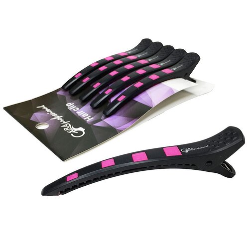 Gera Professional Зажим для волос, цвет черный с розовой силиконовой вставкой, 6 шт/уп