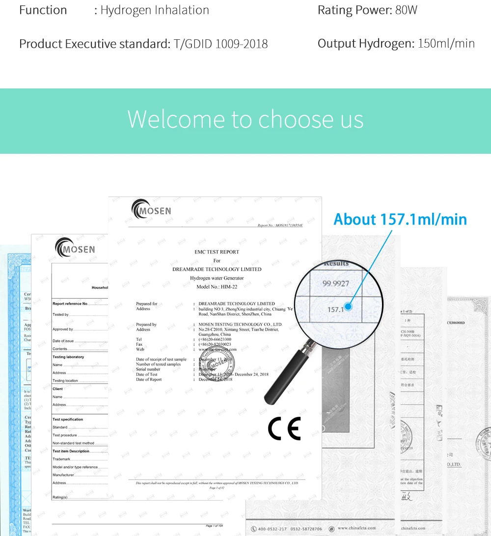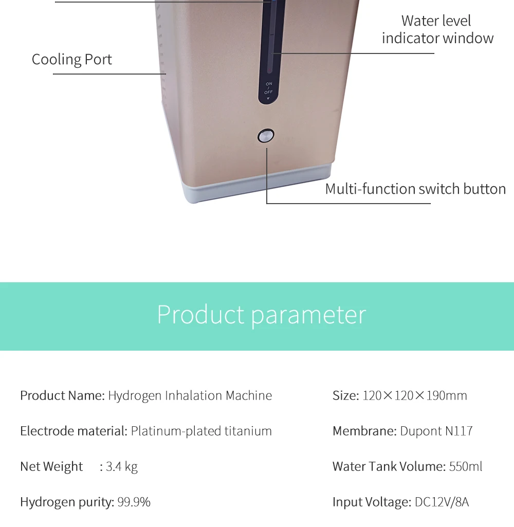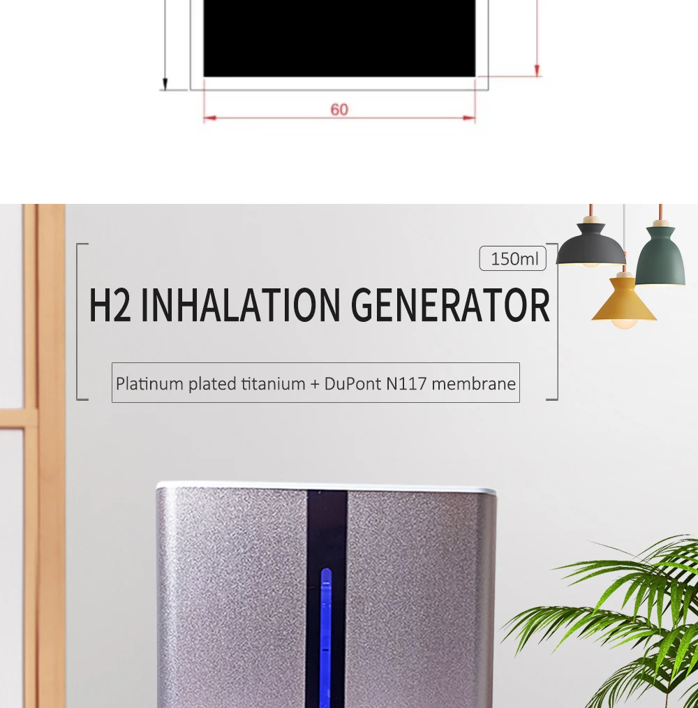 Это водородная Ингаляционная машина с расходом водорода 150 мл и 99.99% высокоочищенным водородным ингаляционным устройством. Водородная Ингаляционная машина с новейшим SPE (твердая поли электролитическая технология) + PEM (протонная обменная мембрана) двухкамерный раствор. Он обладает сильной стойкостью к давлению, сильной производительностью водорода и не производит вредных газов, таких как остаточный хлор и озон.