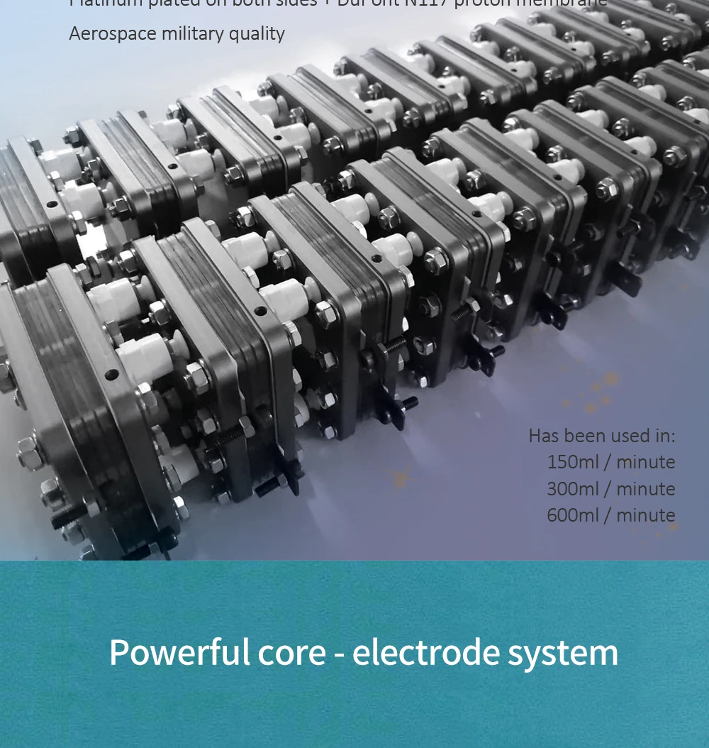 • Новейший SPE (твердая поли электролитическая технология) + PEM (протонно-обменная мембрана) двухкамерный раствор.
