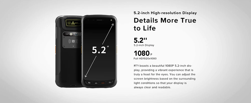 -ОС Android 8,1. -- 5,2 ''IPS FHD 1920x1080p. -- Cortex-A53 Восьмиядерный 2,5 ГГц. Память 3G RAM 32G ROM. -- Связь: 2G/3G/4G/WIFI/BLUETOOTH /USB/GPS(GPS/A GPS, ГЛОНАСС, BeiDou; Внутренняя антенна.) -- RFID считыватель NFC. -- Мы можем настроить Дополнительные функции: 1D сканер штрих-кода; 2D сканер штрих-кода.