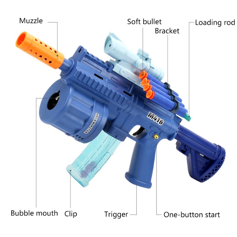 Посылка включает в себя: 1 игрушка с пузырчатыми пушками (1 цель + 8 пуль из пены EVA + 2 пузырчатых раствора)