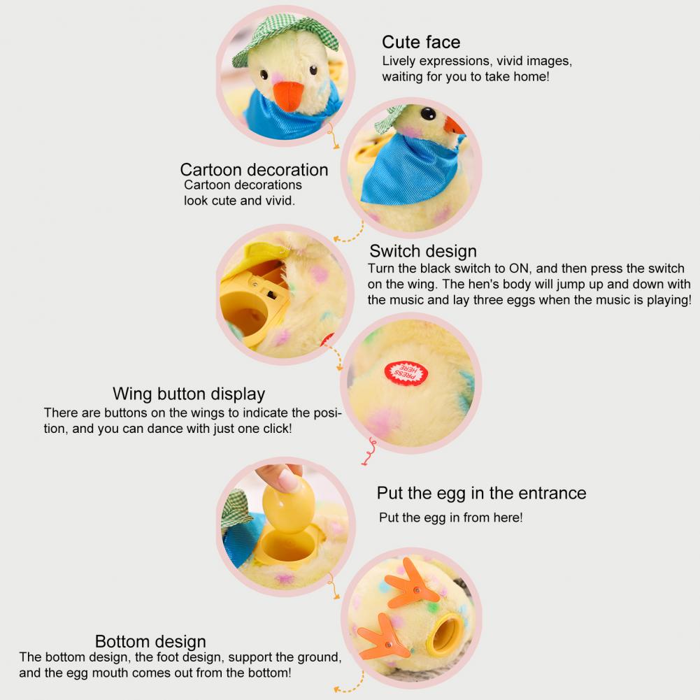 Конечно, наш продукт безопасен для детей, потому что полость яйца гладкая, не царапает руку ребенка. И курица будет танцевать вверх и вниз, что выглядит мило и vivid. Каждая курица оснащена тремя яйцами, и поместите яйцо из верхнего отверстия, и курица может уложить яйцо.
