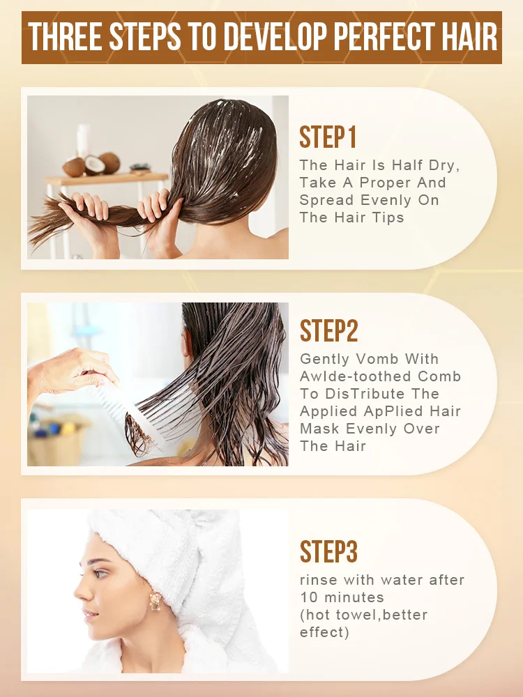 1. Нанесите маску для волос равномерно на волосы после мытья и наполовину высушите без капель.
