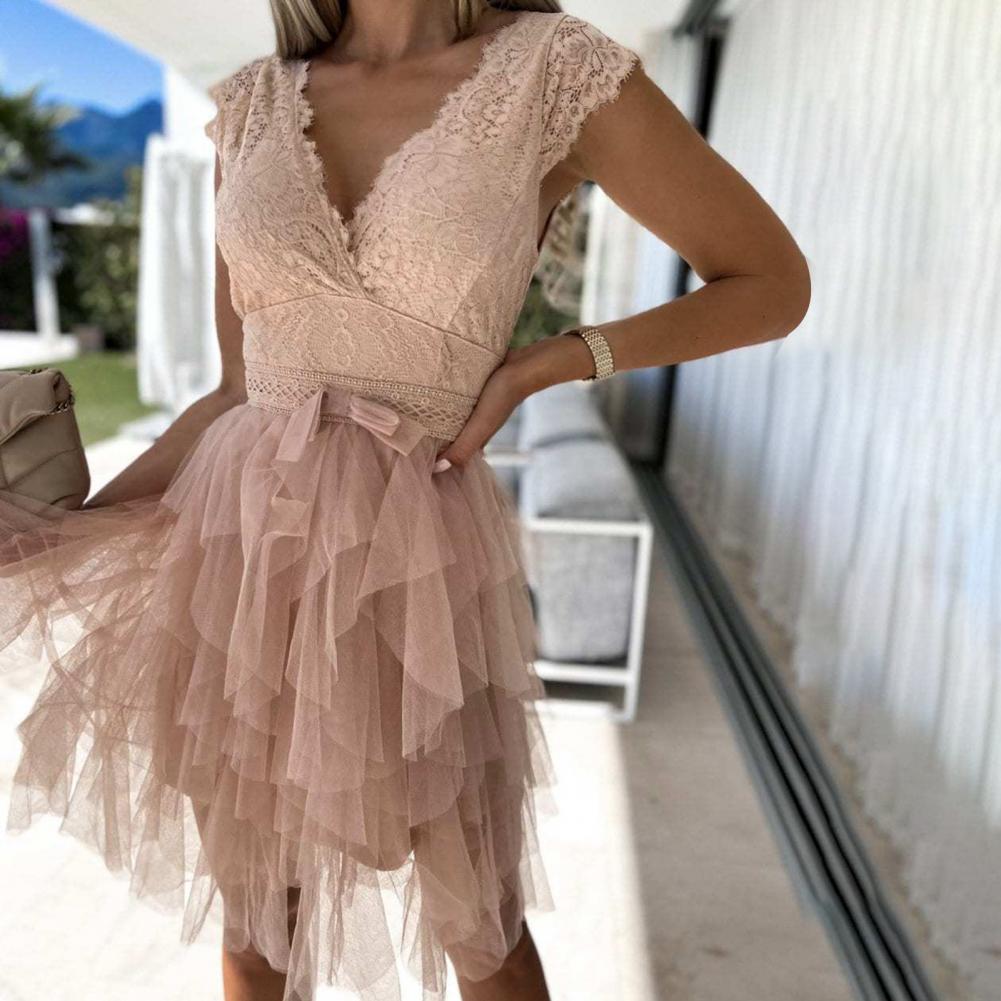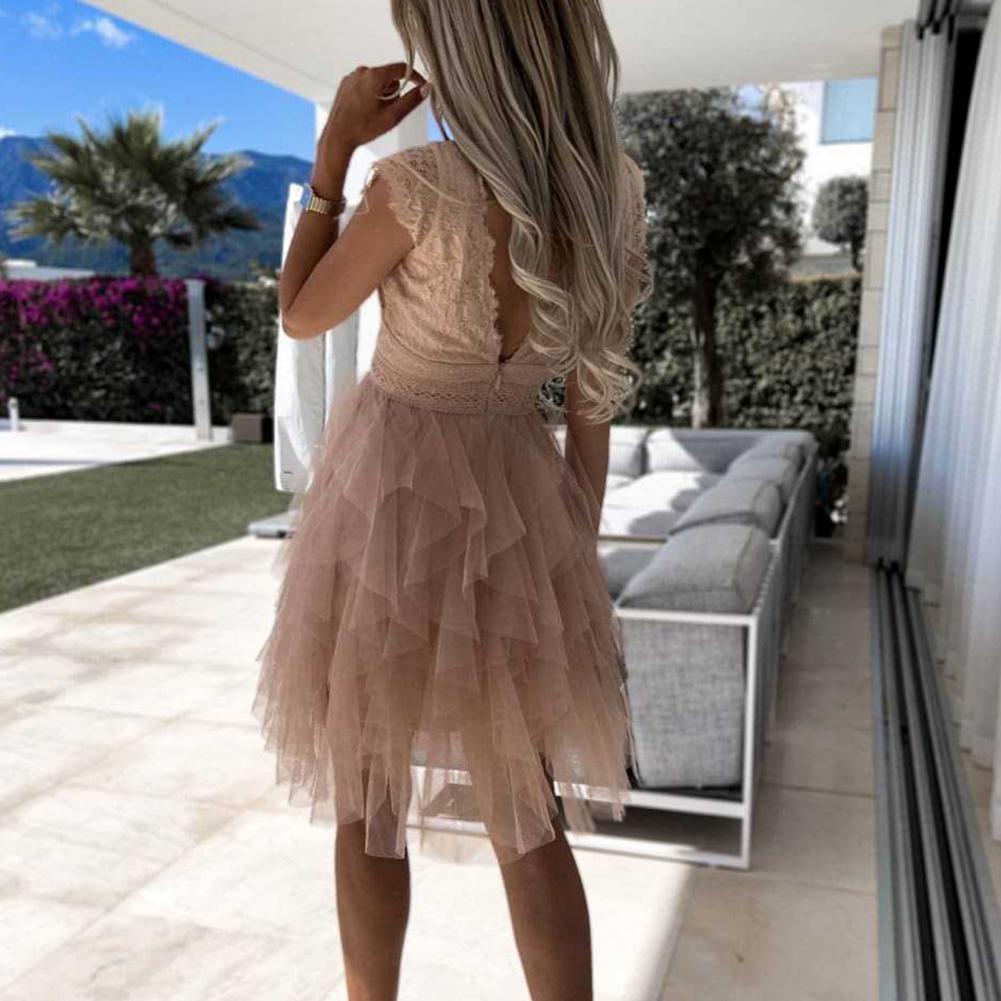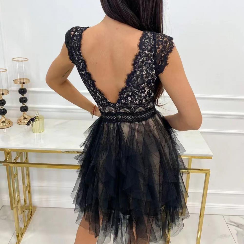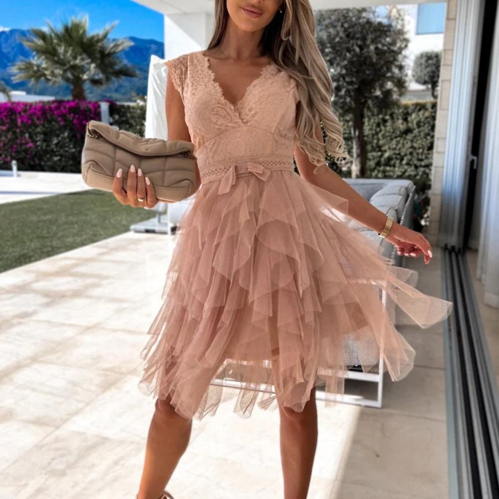Платье без рукавов изготовлено из хорошего кружева и сетчатой пряжи, что обеспечивает ощущение мягкости и комфорта.