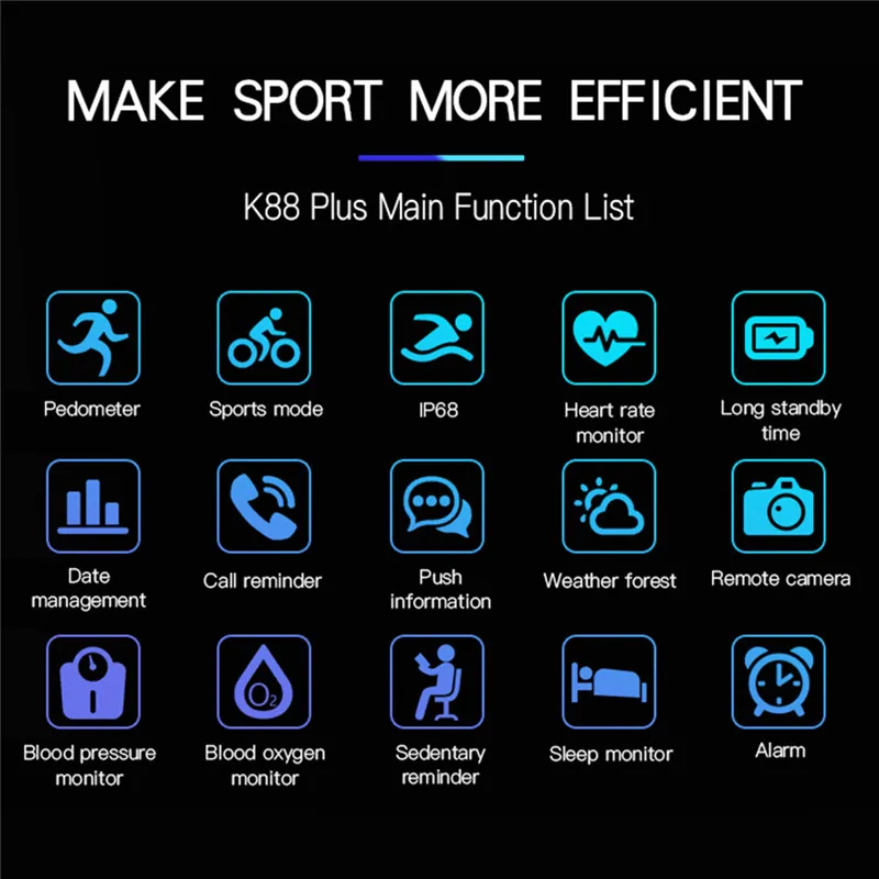 It is managing your sports situation that you can know your body condition better. It tracks steps and shows you how you're stacking up against your daily goals. K88 Plus smartwatch is a device that makes you live in healthier and more intelligent lifestyle. In addition, you can share your data on Facebook and Twitter, which may encourage you and your friends to do exercise and raise interest in sports.
