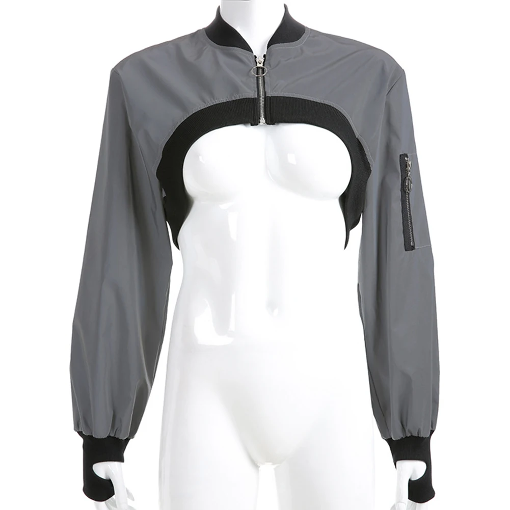 Крутая Женская Светоотражающая короткая куртка-бомбер с длинным рукавом на молнии