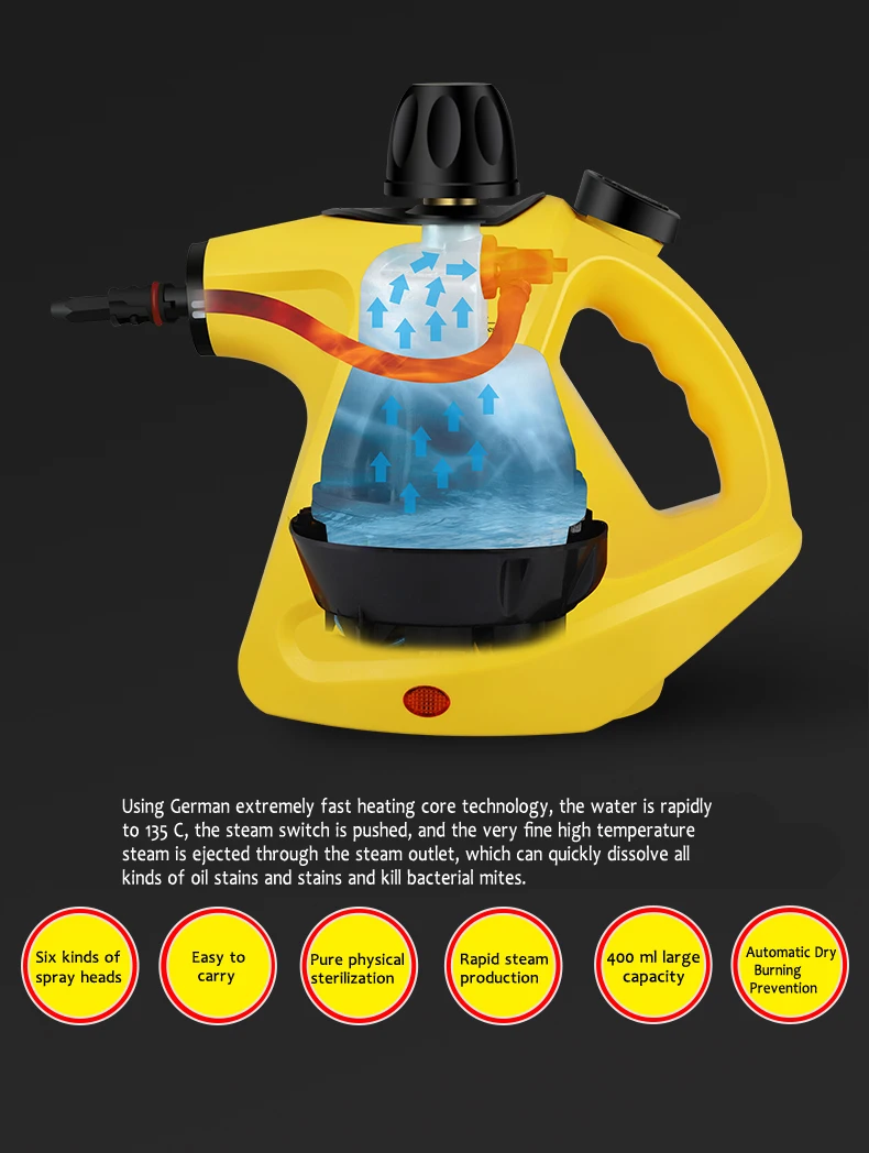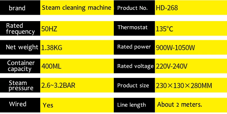 Brand NameEsyheyModel NumberHD-268TypeHandheldCertificationCBCertificationcePower (W)801-1000WVoltage (V)220-240VCleaner TypeSteam CleanerSteam Duration10-15 minutesWater Shortage AlarmYesMeasurement unit100000015Sold insell_by_pieceEach pack1Package weight2.000Package size - length (cm)30Package size - width (cm)25Package size - height (cm)33