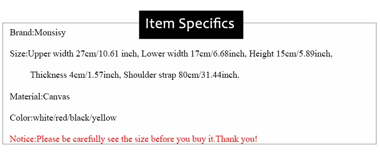 | * Size:Upper width 27cm/10.61 inch, Lower width 17cm/6.68inch, Height 15cm/5.89inch, Thickness 4cm/1.57inch, Shoulder strap 80cm/31.44inch. |
