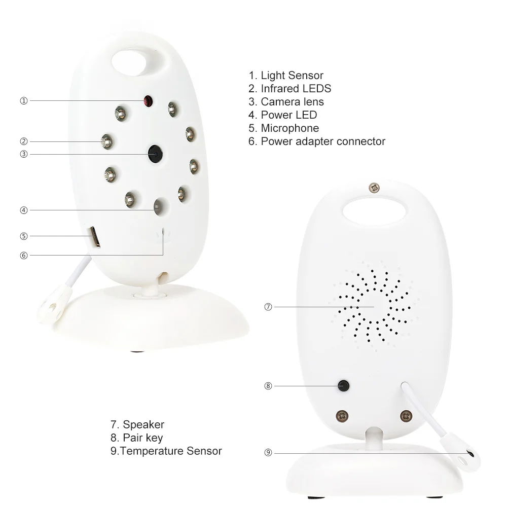 Этот товар имеет комбинацию мониторов родительского блока и детского блока, поддерживает дистанционное управление двухсторонним разговором, колыбельные игры, контроль температуры и т. д., эффективное расстояние соединения до 160 футов в помещении и 850 футов на открытом воздухе. Он также имеет функции ИК-светодиодный режим ночного видения, режим VOX, анти-мерцание и так далее, что действительно необходимо купить для мониторинга ребенка.