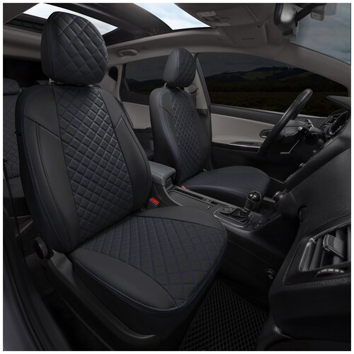 Чехлы на сидения KIA Spectra с 00-11г. / KIA Shuma II с 01-04г. Ромб Экокожа Черный + Синяя строчка, Автопилот, ki-sp-sp-chests-r