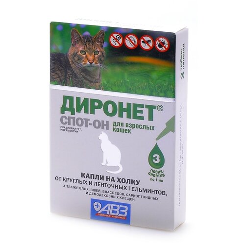 АВЗ Диронет Спот-Он капли для взрослых кошек против круглых и ленточных гельминтов, блох, вшей и клещей - 3 пипетки х 1 мл
