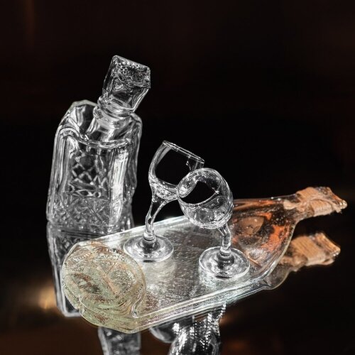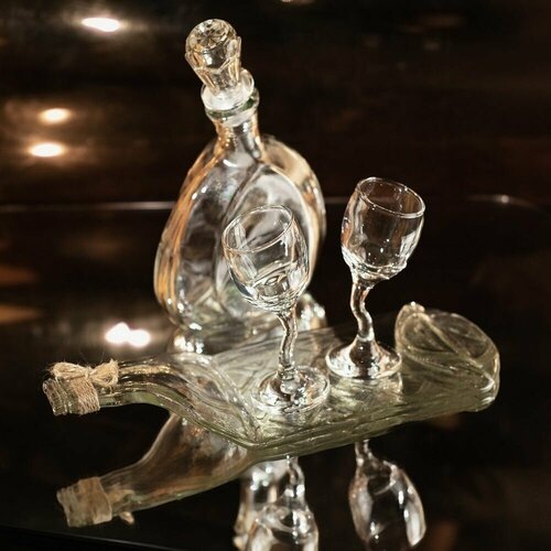 Подарочный набор - две рюмки, плоский графин и блюдо (менажница) из прозрачной винной бутылки серии Хмельное стекло
