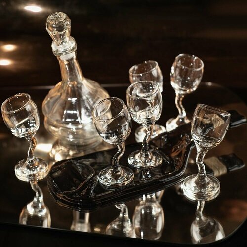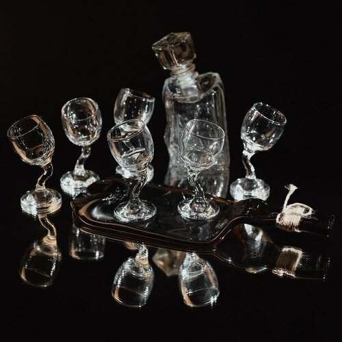 Подарочный набор - шесть рюмок, квадратный графин и блюдо (менажница) из оливковой винной бутылки серии Хмельное стекло