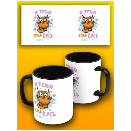 Кружка, 330 мл с принтом черная приколы кот я тебя кусь - 9403