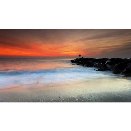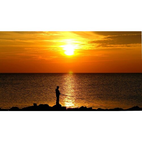 Картина на холсте 50x70 LinxOne "Небо рыбак закат силуэт море" интерьер для дома / декор на стену / дизайн