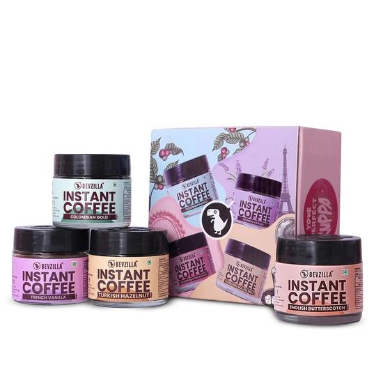 Bevzilla 25 грамм X 4 пакетика ароматизированного растворимого кофе: колумбийское золото, фундук, французская ваниль | по 25 грамм каждый 100% арабика
