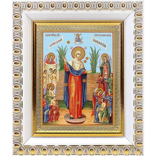 Икона Божией Матери "Всех скорбящих Радость" с грошиками, в белой пластиковой рамке 8,5*10 см