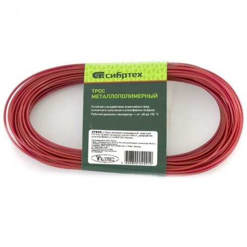 Трос металлополимерный "Сибртех", цвет красный, Пр-2.0, 2,0 мм толщина, моток 20 м.п. Сибртех 551572