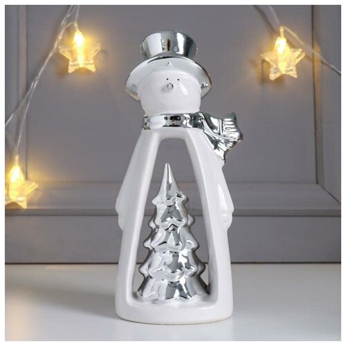 Сувенир керамика "Снеговичок в цилиндре, с ёлочкой" серебро 23,7х8,2х10,9 см