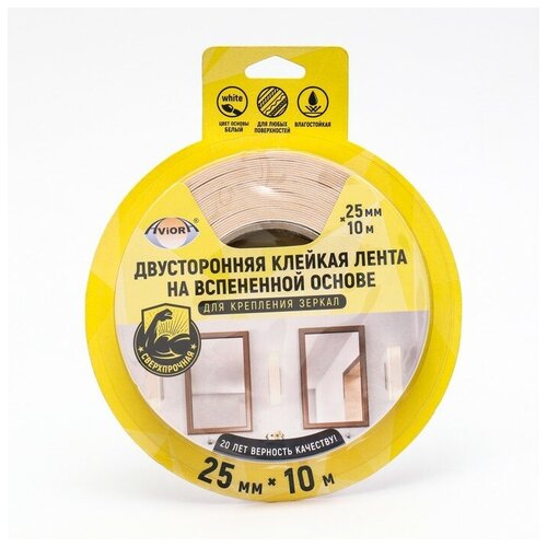 Aviora Двусторонняя клейкая лента на вспененной основе, 25 мм х 10 м, для крепления зеркал, белая,