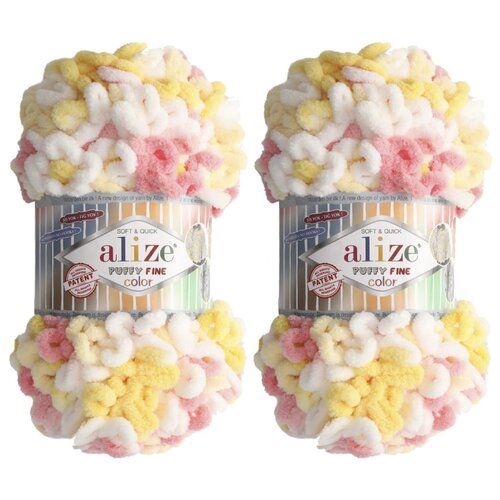 Пряжа Alize Puffy fine color белый-жёлтый-розовый (6367), 100%микрополиэстер, 14,5м, 100г, 5шт