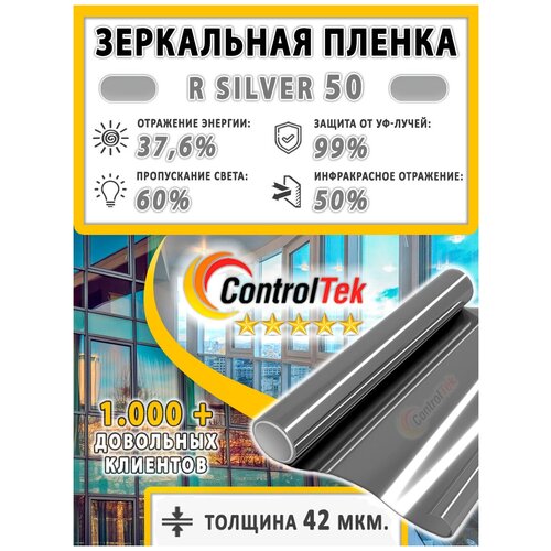 Пленка зеркальная для окон, Солнцезащитная пленка ControlTek R SILVER 50 (серебристая). Размер: 75х3000 см. Самоклеящаяся пленка на окна.