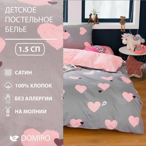 Постельное белье DOMIRO детское 1,5 спальное, 100% Хлопок Сатин. Комплект постельного белья для детей, пододеяльник и наволочка на молнии, простынь