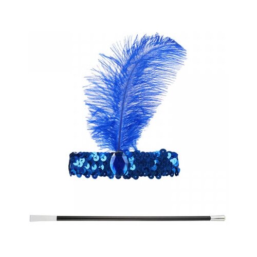 Набор мундштук и повязка синяя на голову с пером "Леди Чикаго", гангстерская вечеринка ободок карнавальный, кабаре гэтсби казино гангстеры