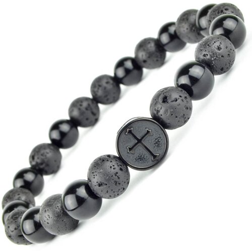 Мужской браслет с крестом из натуральных камней Оникс и Вулканическая лава. Оберег на руку. Подарок мужчине. Размер 17,5 см