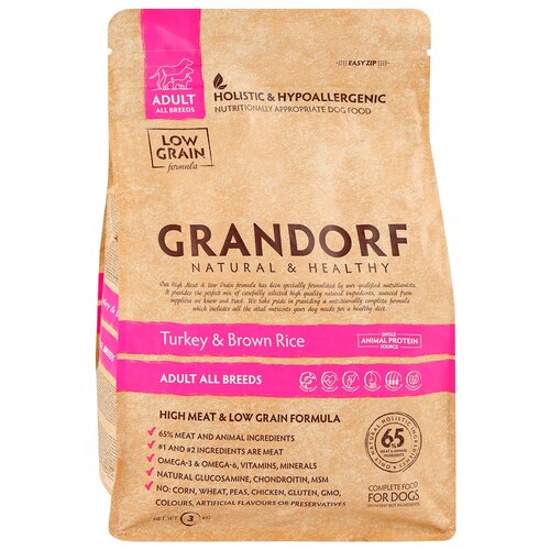 Сухой корм (3 упаковки - 3 х 3 кг) низкозерновой для взрослых собак всех пород Grandorf Turkey & Brown Rice All Breeds - Индейка с бурым рисом - 3 х 3 кг.