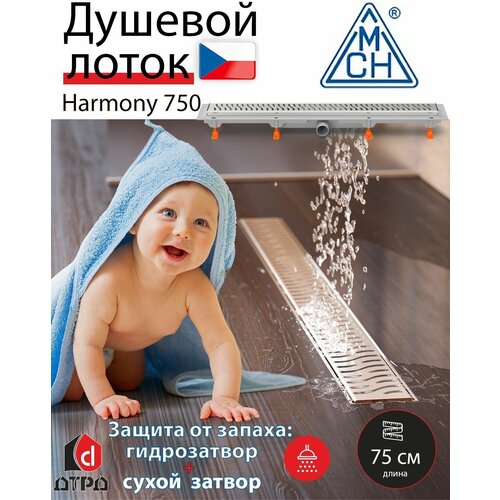 Душевой лоток HARMONY 750 мм с боковым (горизонтальным) сливом D-50 мм MCH Chudej. Дренажный трап для душа с комбинированным затвором.