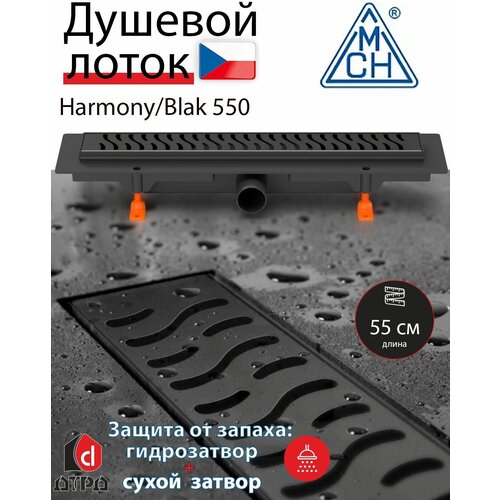 Душевой лоток HARMONY/BLACK чёрный 550 мм с боковым (горизонтальным) сливом D-40 мм MCH Chudej. Дренажный трап для душа с комбинированным затвором.