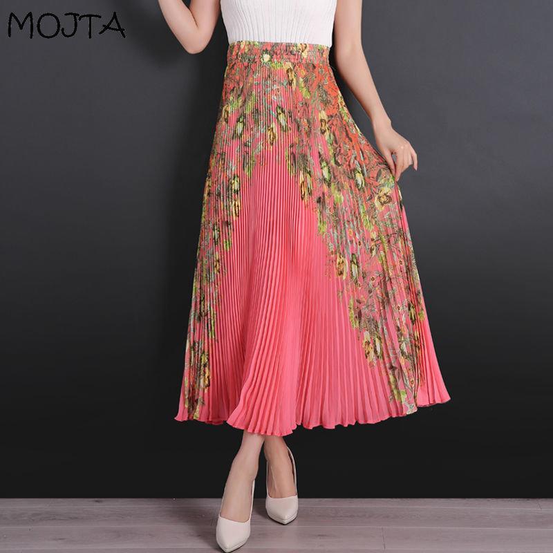 Плюс Размер Юбки для женщин Гибкая талия Принт Лето Маленькие цветы Свободные тонкие плиссированные шифоновые одежды