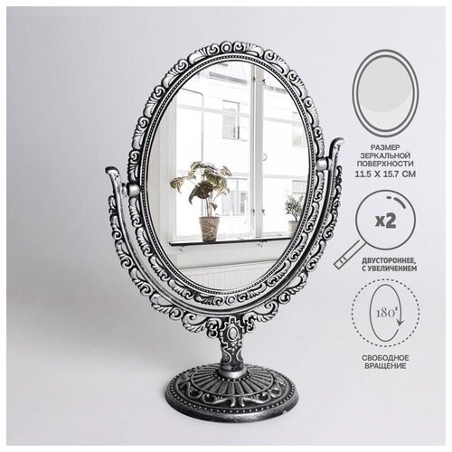 Зеркало настольное, двустороннее, с увеличением, зеркальная поверхность 11,5*15,7 см, цвет серебристый