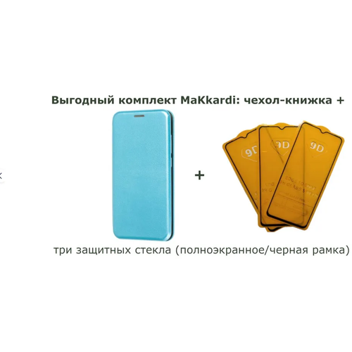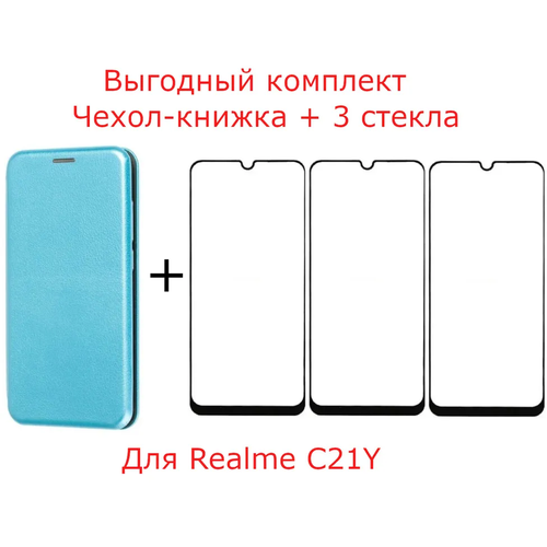 Выгодный комплект 4 в 1 для Realme C21Y : чехол книжка бирюзовый + ТРИ защитных стекла с черной рамкой, на весь экран / реалми ц21у