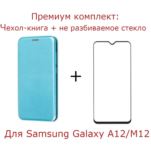 Комплект 2 в 1 для Samsung Galaxy A12 / M12 / A125F : чехол книжка бирюзовый + не разбиваемое противоударное защитное стекло с черной рамкой