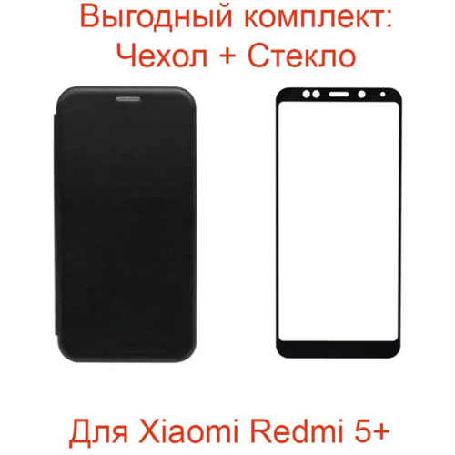 Комплект 2 в 1 для Xiaomi Redmi 5 Plus : чехол книжка черный + защитное стекло полноэкранное с черной рамкой / полный клей / сяоми редми 5 плюс