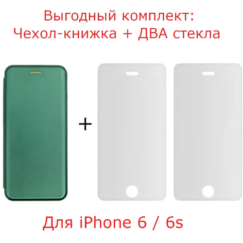 Выгодный комплект 3 в 1 для Apple iPhone 6 / iPhone 6S : чехол книжка кожа изумрудный + 2 защитных стекла прозрачных 2,5D / айфон 6 / айфон 6с