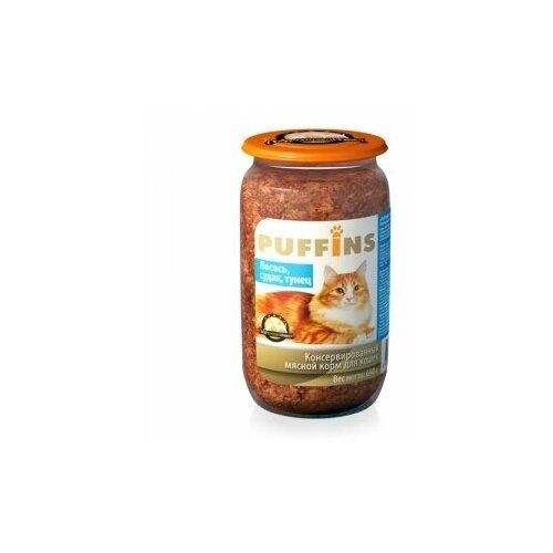 Консервированный мясной корм для кошек, Puffins Лосось/Судак/Тунец, 650гр в стеклянной банке