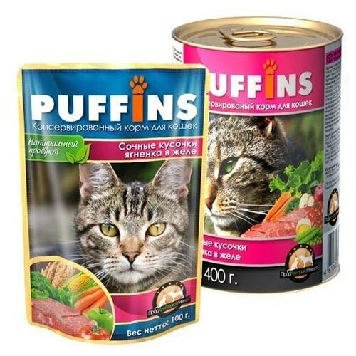 Puffins консервированный корм для кошек, сочные кусочки ягнёнка в желе, 415 гр