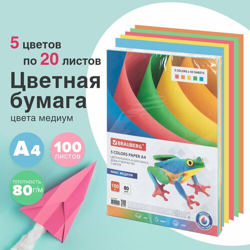 Бумага цветная для офисной техники, А4, 80 г/м2, 100 л., (5 цветов х 20 л.)